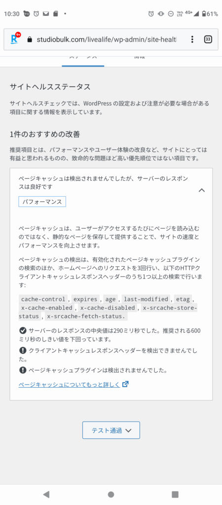 サーバーのレスポンスの中央値は290ミリ秒でした。との事で未対策時の600ミリ秒辺りから300ミリ秒以下に改善。
