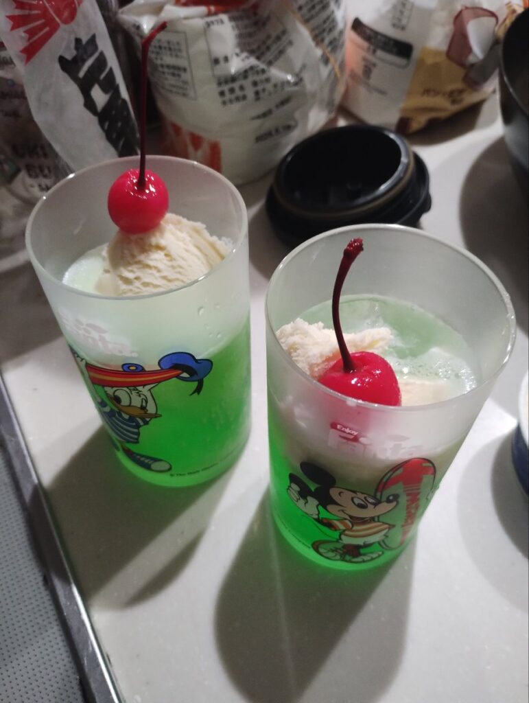 アイス入れたらクリームソーダか?メロンシロップはかき氷用、炭酸水で割るだけ、赤いさくらんぼもスーパーで買える。